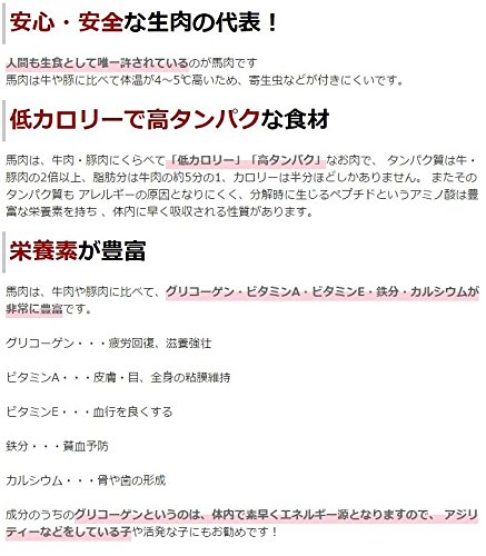 原材料:■原材料馬肉■内容量1kg(250gのトレー×2袋)■成分(100g中)カロリー:110kcal、タンパク質:20g、脂質:2.5g、ビタミンB2:0.24mg、鉄分:4.3mg、カルシウム:11mg, ●原材料:ケール、乳酸菌●成分分析値(100g中)カロリー 15kcal / タンパク質 0.8g / 脂質 0.1g / 灰分 0.5g / 糖質 2.2g / 食物繊維 1.3g