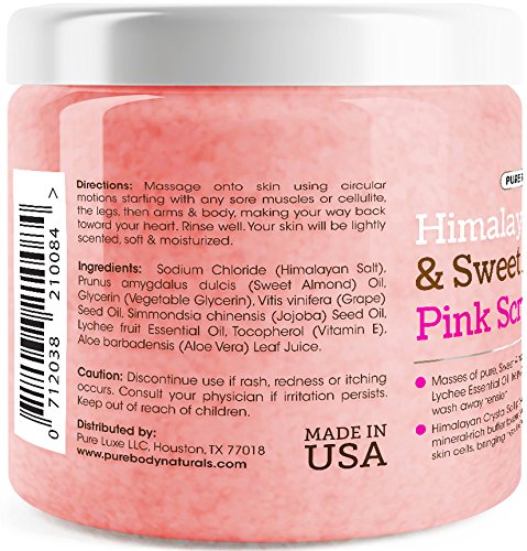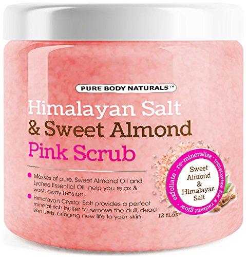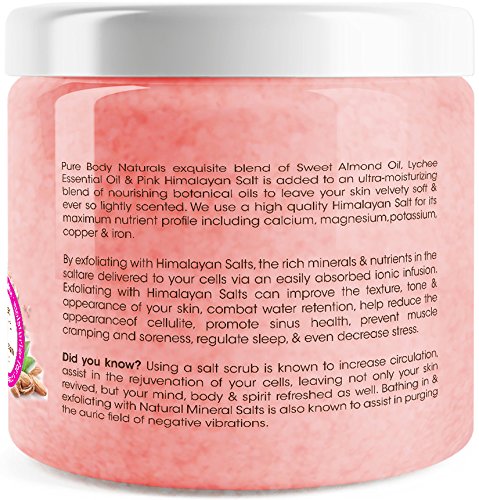 Pure Body Naturals Himalayan Sweet Almond & Lychee Pink Crystal Salt Body Wash Scrub comes with a high quality Himalayan salt for its maximum nutrient profile including calcium, magnesium, potassium, copper & iron; no harmful chemicals.
