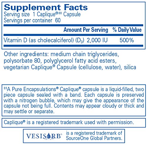 VESIsorb® delivery system offers enhanced absorption by promoting the ability for vitamin D to dissolve readily in an aqueous environment. Vitamin D offers support for calcium homeostasis, promoting bone and cellular health, and cardiometabolic health, promoting healthy inflammatory balance, glucose metabolism, blood flow and antioxidant defense. Each capsule offers 2,000 I.U. of enhanced absorption vitamin D Caplique®. Caplique® Capsule is a registered trademark used by Pure Encapsulations under license. Each Caplique® Capsule is preserved with a nitrogen bubble, which may give the appearance of the capsule not being full. Contents may appear cloudy or thick and may settle or separate.*