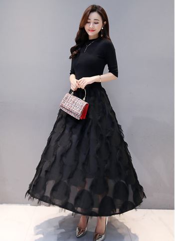 スカートは程よい透け感のロング丈でエレガントな女性らしい印象に♪