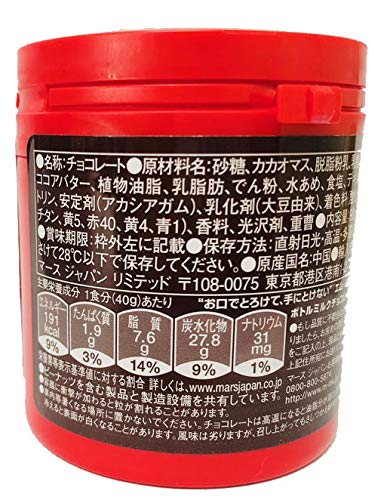 原材料:砂糖、カカオマス、脱脂粉乳、乳糖、ココアバター、植物油脂、乳脂肪、でん粉、水あめ、食塩、デキストリン、安定剤(アカシアガム)、乳化剤(大豆由来)、着色料(酸化チタン、黄5、赤40、黄4、青1)、光沢剤、香料、重曹