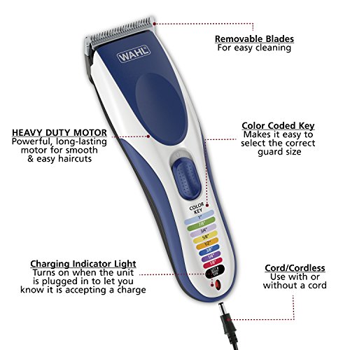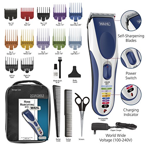 Wahl Color Pro Cordless Rechargeable Hair Clipper, 21 piece Color Coded Hair Cutting with 12 guide combs and soft storage case