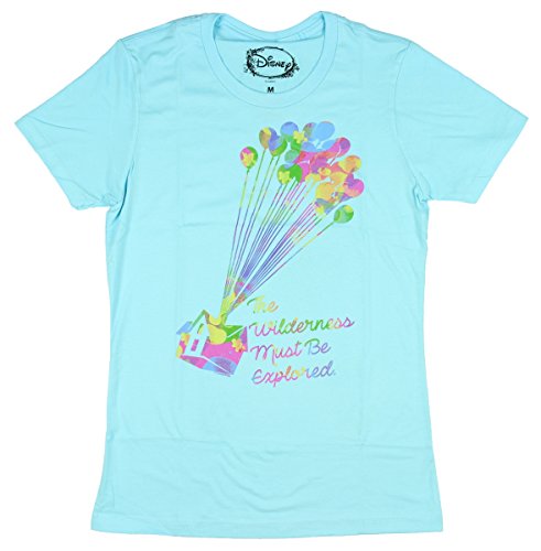 Officially licensed Disney Up juniors t-shirt featuring a balloon house graphic and the words "The Wilderness Must Be Explored". Made of 100% cotton.