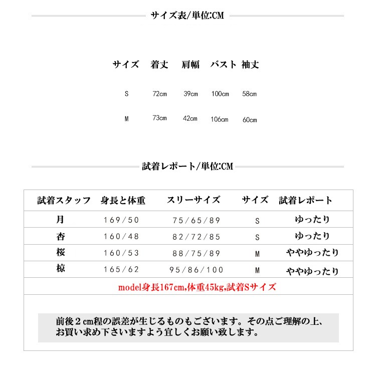 材質: 96%ポリエステル,4%スパンデックス色:カーキ、ブラックサイズ(cm) :S: 着丈:72cm 肩幅:39cm バスト:100cm 袖丈:58cmM: 着丈:73cm 肩幅:42cm バスト:106cm 袖丈:60cm注意:平置き実寸採寸のため生地の伸縮性や素材によっては多少の誤差が出る場合がございます。ご了承下さい。特徴:通勤ジャケットですが、全体の設計はカジュアル のスタイルので、普通の時にも着用できます。純色のブラックとカーキなので、どんな色のシャツにも合わせて、ファッション感になります。
