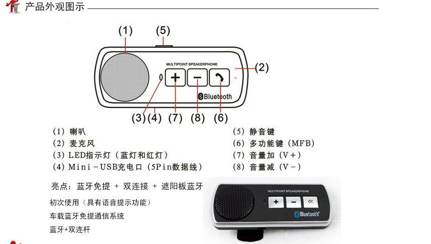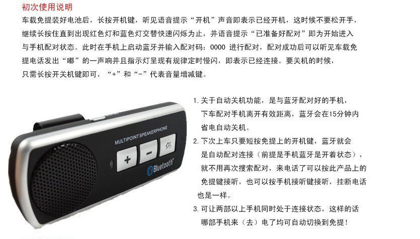 After the car handsfree battery installed, press the power button, hear the "beep" sound that said it had turned, and this time do not let go, continue to hold down long until the red light and blue light rapidly flashes until, that is, entered, then start the Bluetooth on the phone and enter the pairing code: 0000 pairing after successful pairing could hear car speakerphone to issue a "beep" sound and lights presented regularly timed slow flash, that means is connected. To shut down time, just press the switch button, "+" and "-" represents the volume change keys.