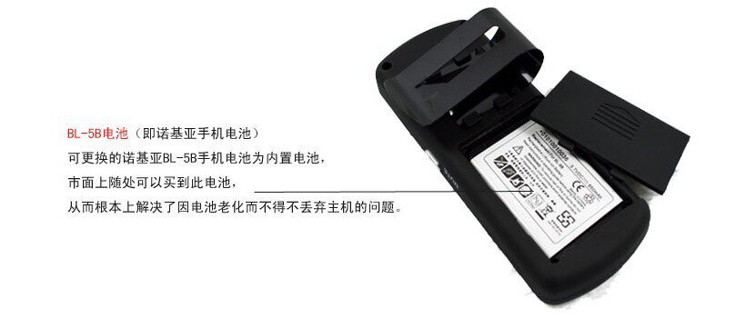 Accessories: USB car charger cigarette lighter socket type 1, MINIUSB charging cable 1, BL-5B battery (ie Nokia mobile phone battery) and a hook one. Replaceable lithium battery. Can be replaced by mobile phones Nokia BL-5B battery built-in battery, this battery can be purchased anywhere on the market, so a fundamental solution to aging and had to be discarded due to battery issue hosts.