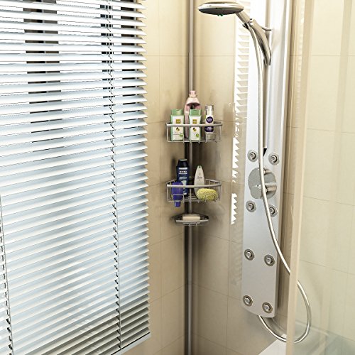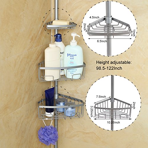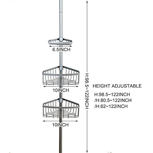 - Extra-long tension pole allows you to install it in a tub or shower corner space. Adjustable height: 98.5" to 122".