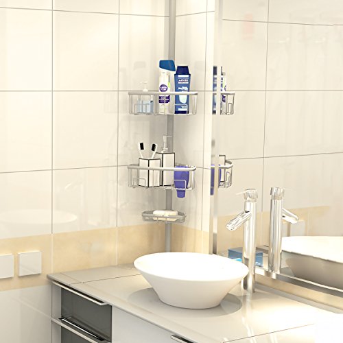 - Bathroom shower tension caddy with 3 storage baskets and 4 fixed hookers provides huge spaces for storaging shampoo, conditioner, soap -pearl, shower sponge, etc.