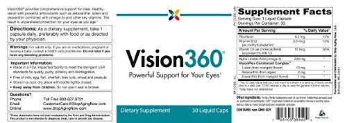 Vision360 provides comprehensive support for clear, healthy vision with just one small capsule per day. It's the only supplement on the market to combine the powerful VisionPlex Carotenoid Complex with omega-3s and other key nutrients. VisionPlex Carotenoid Complex features a blend of the carotenoid antioxidants astaxanthin, lutein and zeaxanthin, which provides powerful support for the retina, macula and overall eye health. Vision360 provides a powerful dosage of plant-based omega-3s in the form of alpha linoleic acid from perilla seed. This helps to keep the eyes healthy, nourished and lubricated by promoting a healthy inflammatory response and enhancing natural tear production.This incredible formula is then further enhanced with vitamins D3, B2 and B12 for synergistic eye health benefits, as well as sunflower phospholipids for increased bioavailability. If you want to retain your ability to see clearly as you age, look no further than Vision360.Feature