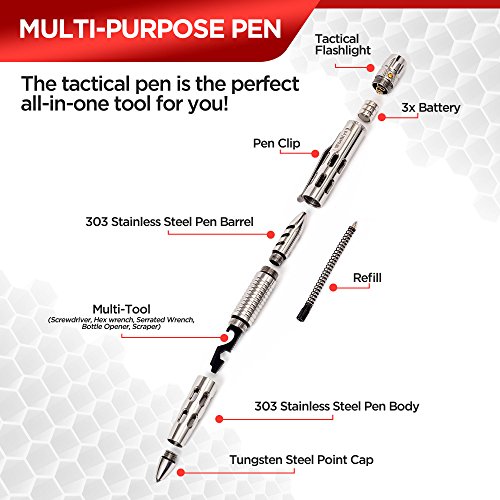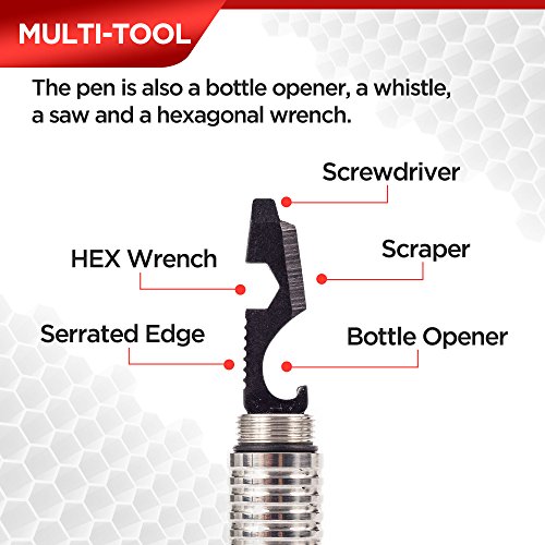 - MADE TO LAST – Crafted from military grade tungsten steel, the tactical pen for self defense won’t stain, won’t rust, and won’t fail. Thanks to its robust construction, the tactical pen with glass breaker can be used for emergency car window breaking or to fend off an attacker.