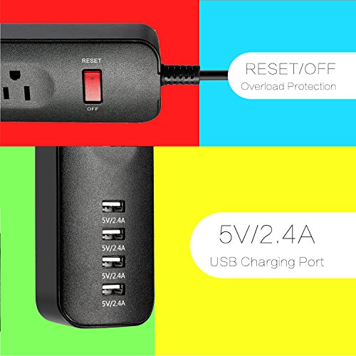 ? Specifications Max Power: 1250W Rated Voltage: 125V Rated Current: 10A USB Charger Output: 5V===1A/ 5V==2.4A (Max 3.4A) USB Quantity: 4 USB outlets Outlet Quantity:6 AC plugs Material: Fire-resistance PC shell, PVC copper wire Over-current protection,over load protection Cord Length: 6ft power cord