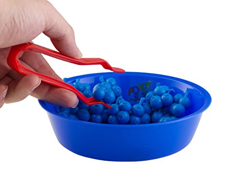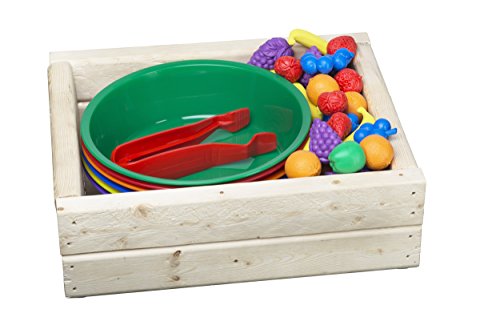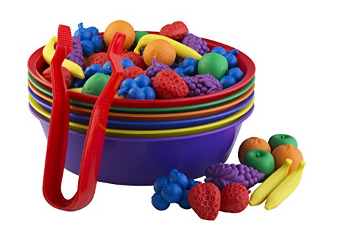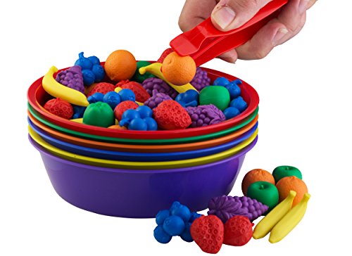 Use tweezers to grasp and correctly place fruit into matching bowls. Improve fine motor skills and hand/eye coordination while sorting the fruit into the colored bowls. Help your child develop imaginary play, learn colors, identify fruits and increase their fine motor skills. Also helps develop pincer grasp while manipulation fruits into correct bowls. Includes one wood crate, six colored bowls, assorted fruit and one tweezer.Feature