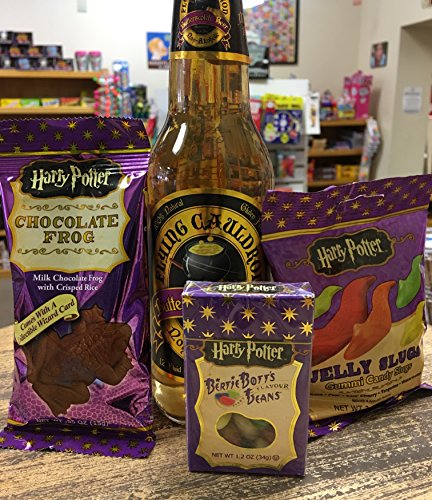 -. Feature : Gift Set includes 4 items: (1) Flying Cauldron Butterscotch Beer, (1) Chocolate Frog, (1) Jelly Slugs, (1) Bertie Botts Beans / The Milk Chocolate Frog includes a Collectible Wizard Card!