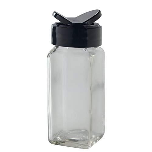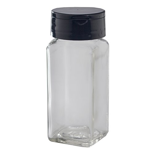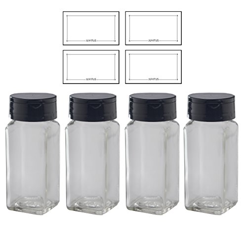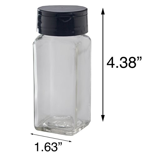 4 oz / 120 ml Clear Glass Square Spice Jar with Black Sifter (4 pack) + Labels - Two Sided Sifter Cap (shaker holes / pour open) and Freshness Seal for a professional look