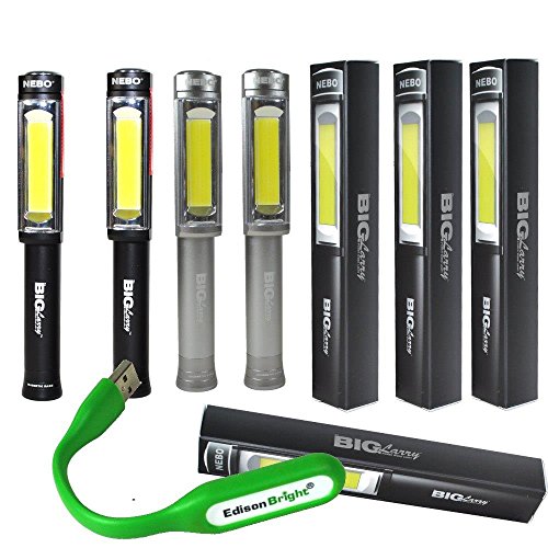 Two color 4 lights bundle: Nebo Big Larry 400 lumen Flashlight 6306 COB LED Magnetic Worklight (Two each Black & Grey) with Six Nebo AA batteries and EdisonBright USB powered reading light bundle