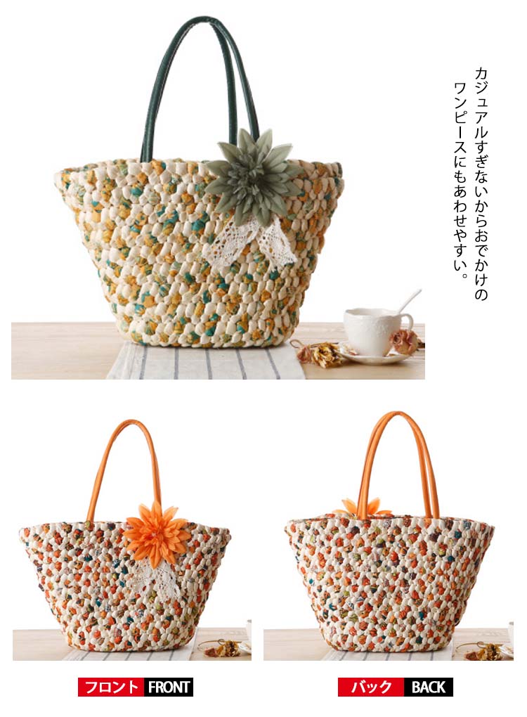 | 春夏おすすめ!使いやすいサイズのカゴバッグ。持つだけで乙女心がウキウキしてくる、フェミニンで女性らしいデザインです。 すっきりして見える台形シルエットでコーデの邪魔もせず、長めの持ち手で肩掛けも出来ちゃう♪ 浴衣や甚平の時にも合わせやすいデザインです。 入口はファスナーで荷物の飛び出しにも安心♪カジュアルすぎないからおでかけのワンピースにもあわせやすい。 | |