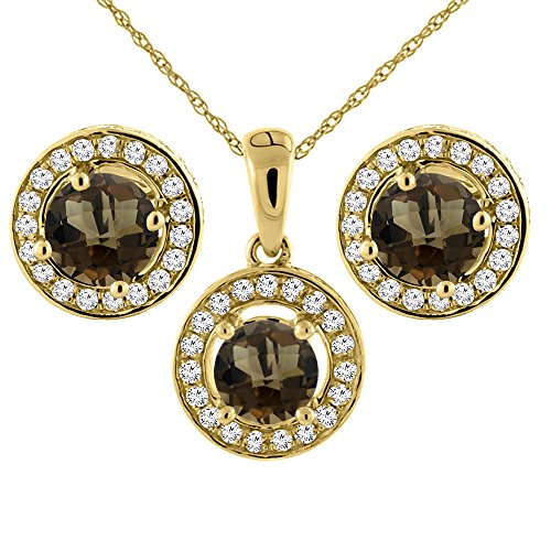 -. Title : 14K Yellow Gold Natural Smoky Topaz Earrings and Pendant Set with Diamond Halo Round 5 mm