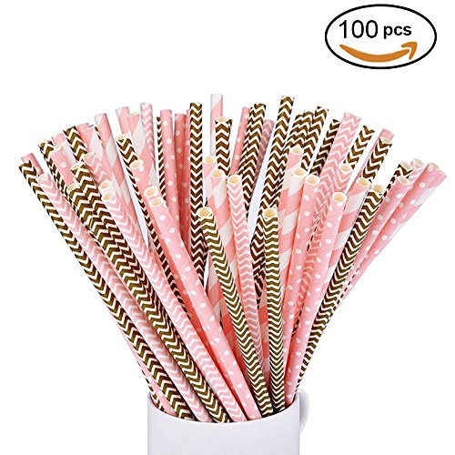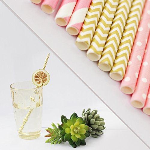 Megrocle 4 patterns Paper Straws Drinking Decoration Straw sets for Wedding, Birthday, Christmas, Celebration Parties, Gold and Pink, 100 Pack