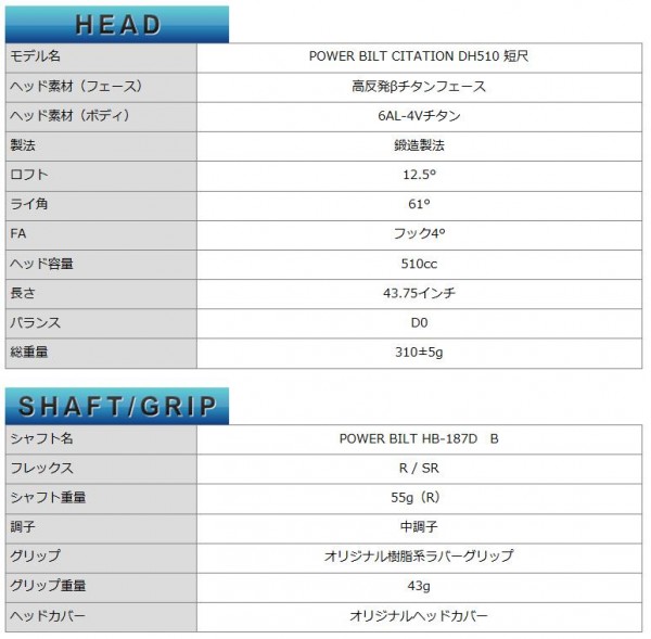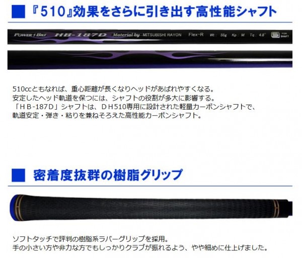 fk094igrjsルールを超えた飛びでゴルフをさらに楽しむ。DH-510短尺チタンドライバー。通常のヘッド重量(約195g)より15g重い「210g重ヘッド」搭載。ハンマー効果によりインパクト時のヘッドとボールの衝突エネルギーが増大し、ビッグキャリーを実現。
