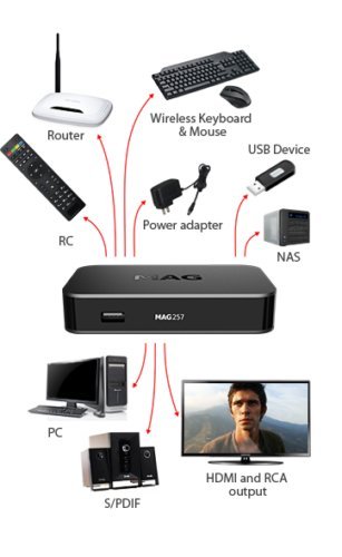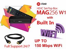 Studio : Infomir Publisher : Infomir Binding : Electronics Product Description DESCRIPTION of MAG 256 With Wi-Fi Dongle MAG 256 IPTV Set Top Box Contents: MAG 256 IPTV Box Power Adapter: Output 5v ~ 2A Remote Control Batteries User Manual Supplied With HDMI Cable Compatible with Live Streamed IPTV Movie/Video/Music Player Via USB USB Drives Network Streams Supported Video Formats MKV, MPEG-TS, MPEG-PS, M2TS, VOB, AVI, MOV, MP4, ASF, QT, WMV etc Built in Internet Browser Middleware Supported: Stalker, OFT, Netup, SmartLabs, Netris, Beeniu Resolution: Up to 1080p CPU: STiH301 RAM: 1Gb Flash Memory: 512Mb Operating System: Linux 3.3 Case: Plastic Colour: Black Dimensions: 132 x 87 x 26mm INCLUDES Wi-Fi adapter Front of Box Power Indicator LED USB 3.0 Port Rear of Box USB 2.0 Port HDMI Socket Ethernet Port (100Mbps) Power Input 5mm A/V Port SPDIF Optical Out USB Wifi adapter Use as IPTV box that can be connected to your TV The MAG 256 can provides access to web services such as Picasa, Online Cinemas Weather Forecast Browse the web from your living room using the built-in web browser Stream content over your local network Play content from USB storage devices 0