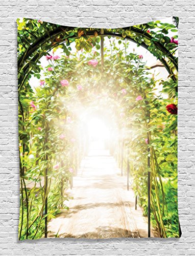 Fairy Tapestry by Ambesonne, Botanic Garden Forest Tapestry Green Leaves Roses Magical Sunlight View Fairy Design Wall Art Satin Fabric Wall Hanging for Living Room Bedroom Dorm Decor Green Beige Pink