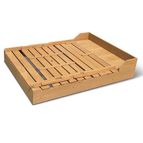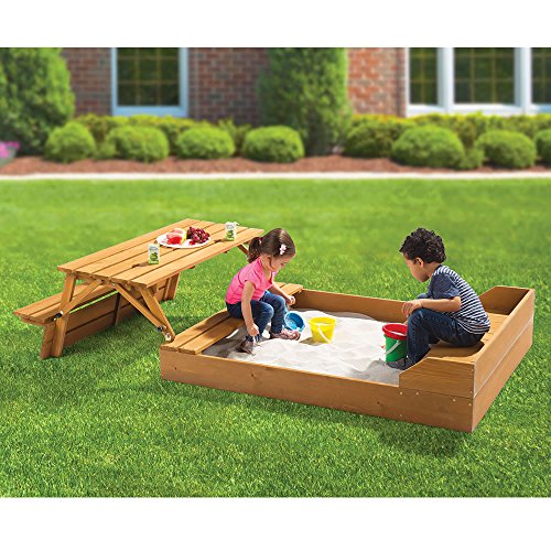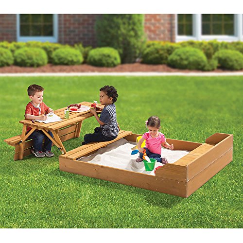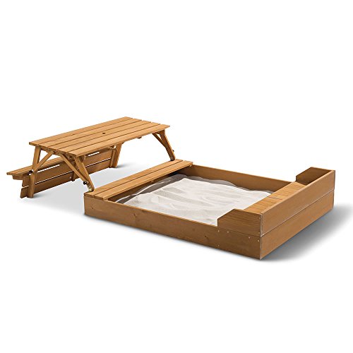 Studio : Merry Products Publisher : Merry Products Binding : Toy Product Description Available only from Hammacher Schlemmer, this is the sandbox with a lid that transforms into a picnic table. Constructed of sturdy Canadian Hemlock, the 2-in-1 unit provides a 41 1/4-gallon sandbox and 43 1/4" L x 19" W picnic area when open, and folds down to a compact 87" L x 43 1/4" W x 11" H when not in use. The sandboxes' 6 1/4"-tall sides ensure sand (required) stays contained and its 41 3/4" L x 36 1/4" W area provides ample space for constructing sand castles or searching for buried treasure. The picnic benches' support up to 100 lbs. each and the table's five-plank surface is ideal for holding a little one's lunch or toddler-sized refreshments. When playtime is over, the picnic table folds flat over the sandbox to keep animals and branches out while restoring lawn space to the yard. Assembly required. Open 87" L x 43 1/4" W x 17 3/4" H, closed 87" L x 43 1/4" W x 11" H. (54 lbs.) 0