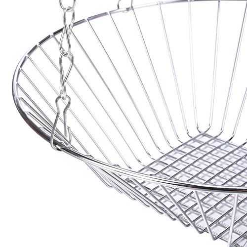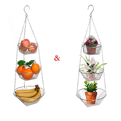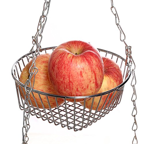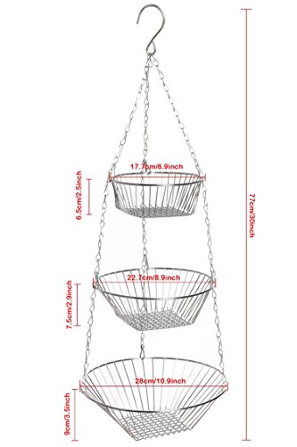 Product Description Find the perfect place for hanging the fruit basket, maybe above the kitchen counter for example, Another way is to hang the baskets in front of a window so the fruits and veggies get plenty of light and stay healthy for a long time Product Specification: Material: Iron Plating Color: Chrome Total Height: 77cm/30inch Top Basket Size: 17.7 x 6.5cm/6.9 x 2.5inch (D x H) Middle Basket Size: 22.7 x 7.5cm/8.9 x 2.9inch (D x H) Bottom Basket Size: 28 x 9cm/10.9 x 3.5inch (D x H) Tier: 3 Tiers Use: Home Kitchen Package Content: 1 x Basket Note: Due to the difference between different monitors, the picture may not reflect the actual color of the item. We guarantee the style is the same as shown in the pictures, but not the same performance on different bodies as on the model. Thank you! 0