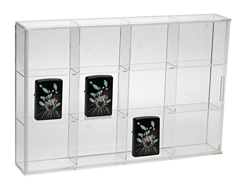 Studio : SAFE Publisher : SAFE Binding : Health and Beauty Product Description Made of crystal clear acrylic glass, these sleek cabinets are made to hang on your wall and come in 6 different styles/sizes. Since they are frameless and hingeless, the focus is on your Vintage Zippo collection, not the hardware. The clear front panel slides into place. Hang over a mirror and add top UV lighting for a dramatic effect to complement any decor. No. 5256 - 12 compartments 2-3/4" x 2-1/2" x 1-1/2" each Overall cabinet size 11-13/16" x 7-7/8" x 1-3/4" deep 0