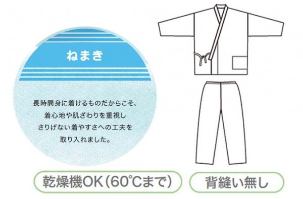通常のガーゼ寝巻は本体生地とガーゼ生地が別々にある2枚構造ですが、当商品は介護時の引っ張る力にもある程度耐える事が出来るようにするため、ガーゼ生地と本体生地を一体化させた特殊構造にしています。 そのため通常の寝巻の欠点である、生地の弱いガーゼ部分がすぐに破れる等の寝巻の破損を軽減します。