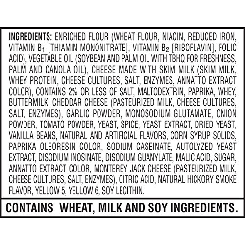 Cheez-It crackers are baked with 100% real cheese that's been carefully aged for a one-of-a-kind taste. Ingredients contain wheat, milk and soy.