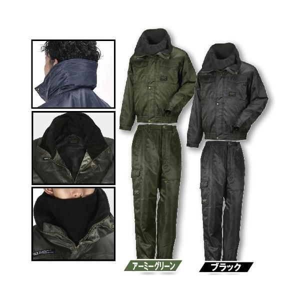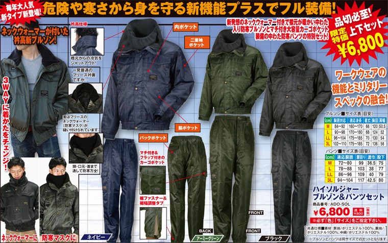 危険や寒さから身を守る新機能プラスでフル装備上下セットが限定特価!毎年大人気!品切必至の上下セットが新タイプで新登場!限定特価¥6,800上下セット! ワークウェアの機能とミリタリースペックの融合! 新発想の、ネックウォーマー付きで襟元が暖かい中わた入り防寒ブルゾンと、マチ付き大容量カーゴポケット装備の中わた防寒パンツの特別セット! 【ネックウォーマーが付いた衿高新ブルゾン!】 3WAYに着かたをチェンジ! 一見普通のフリース衿裏ですが… 実はフリースのネックウォーマー(防寒マスク)が縫い付けられています。 頭・口元・首まで通して防寒万全! 衿高仕様で襟元からの冷気をシャットアウト! 他にも機能満載 ・二重袖ポケット ・脇ポケット ・内ポケット 【中わた入り防寒カーゴパンツ】 ・マチ付き&フラップ付きのカーゴポケット ・裾ファスナー&裾幅調整タブ ・バックポケット共通仕様
