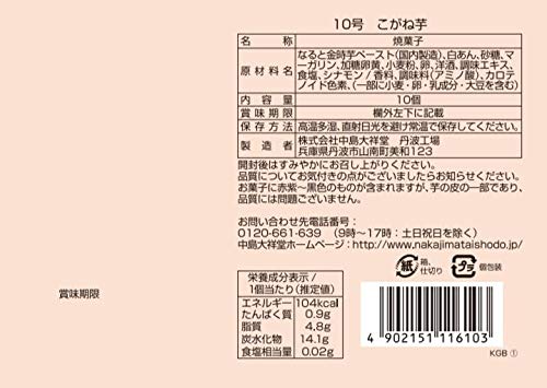 原材料:なると金時芋ペースト(国内製造)、白あん、砂糖、マーガリン、加糖卵黄、小麦粉、卵、洋酒、調味エキス、食塩、シナモン/香料、調味料(アミノ酸)、カロテノイド色素、(一部に小麦・卵・乳成分・大豆を含む)