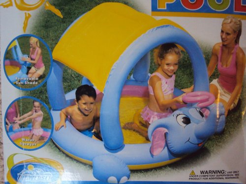 -. Binding : Toy -. Brand : INTEX -. EAN : 0078257564378 -. Feature : Water sprayer attaches to garden hose / Removable sun shade over wading pool / Removable top can be used on the grass as a sun shade or crawl thru play tunnel / Water capacity 30 gallons / 63"x54"x38" -. IsAdultProduct : 0 -. Label : Intex -. Manufacturer : Intex -. ProductGroup : Toy -. ProductTypeName : TOYS_AND_GAMES -. Publisher : Intex -. Studio : Intex -. Title : Lil' Elephant Spray Pool -. UPC : 078257564378