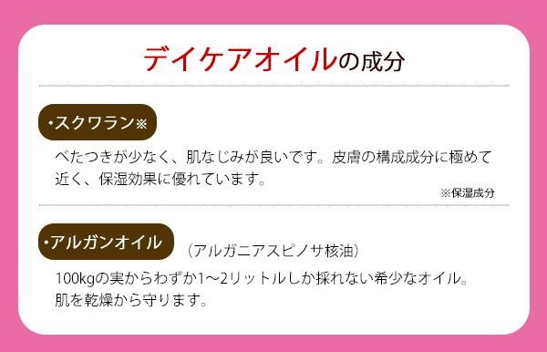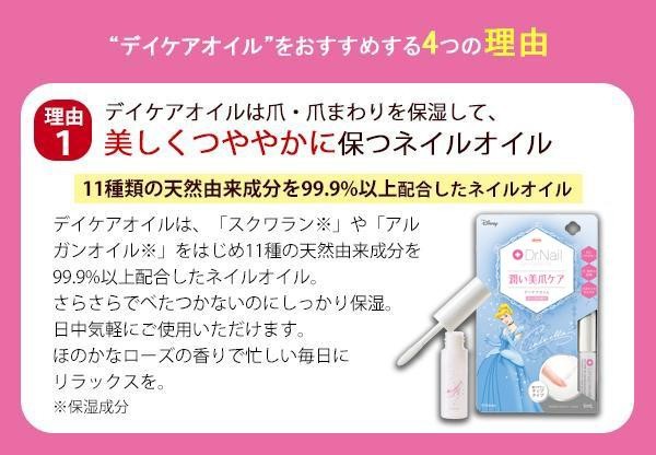| 天然由来成分の潤いヴェールで美爪、キープ!デイケアオイルは爪・爪まわりを保湿して、美しくつややかに保つネイルオイルです。さらさらでべたつかないので日中気軽に使用出来ます!1日3回、10本の手の指に塗布した場合、80日ほどお使いいただけます。(使用量などにより、個人差があります) |