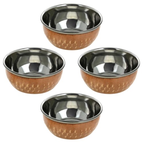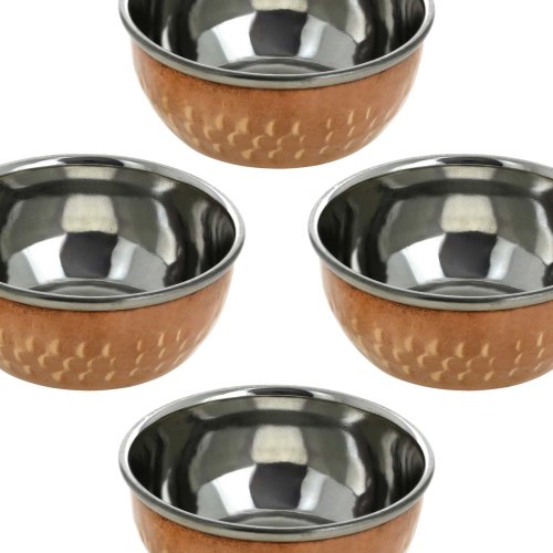 -. Binding : Kitchen -. Brand : ShalinIndia -. Color : Gold -. EAN : 5055384730390 -. Feature : AUTHENTIC INDIAN DINNER Bowls Indian cooking utensils & servingware made entirely by hand in India / SINGLE SERVING DESIGN Indian dishes Each hold 150mL and are 1.5 Inches high by 3.25 Inches in diameter; Weight 120 grams, Total Weight 480 grams / PERFECT FOR ENTERTAINING Use these traditional Indian dishes for curries, daal & other recipes / NONREACTIVE, BEAUTIFUL DINNERWARE Our copper bowls are lined with stainless steel to preserve flavor / UNIQUE ANNIVERSARY GIFT IDEA Give this set of copper bowls as copper gifts for a 7th anniversary -. Label : ShalinCraft -. Manufacturer : ShalinCraft -. Model : MN-serving_bowl_set_4 -. MPN : MPN-serving_bowl_set_4 -. PackageQuantity : 4 -. PartNumber : MPN-serving_bowl_set_4 -. ProductGroup : Kitchen -. ProductTypeName : KITCHEN -. Publisher : ShalinCraft -. Size : 4 inch -. Studio : ShalinCraft -. Title : Copper Serving Bowl Dinnerware Indian Utensils Serveware Katoris Set of 4 -. Warranty : Do not put copper utensils in dishwashers as acids contained in the soap may tarnish the copper ware permanently. Clean it either with lemon juice or mix a bit of flour, salt and vinegar to bring back the colour and remove any oxidisation from the water you are purifying.