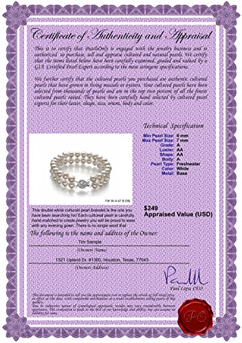 Included FREE with your cultured pearls bracelet is an Appraisal Certificate prepared by a Pearl Expert describing in detail your bracelet size, color and body shape. A color picture of your bracelet is shown on each certificate to ensure carefree insurance claims should those ever arise. It is a wonderful keepsake that shows you truly care.