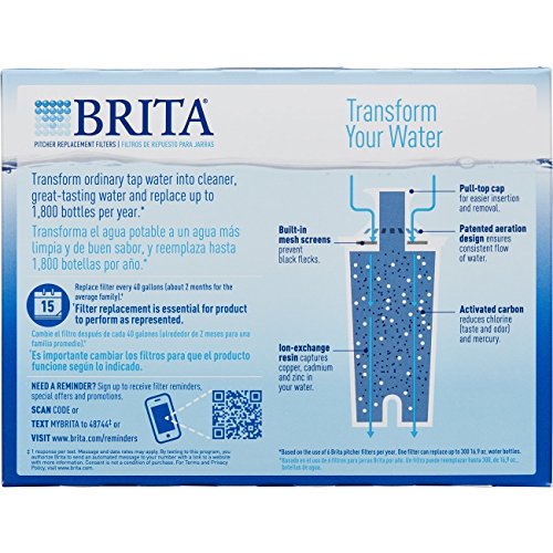 Studio : Brita Publisher : Brita Binding : Kitchen Product Description Keep tap water healthier and tasting better when you regularly change your Brita replacement filter. Made to fit all Brita pitchers and dispensers, this replacement filter reduces copper, mercury and cadmium impurities that can adversely affect your health over time, while cutting chlorine taste and odor to deliver great tasting water. Designed to leave no black flecks in your water and with no pre-soak required, the Advanced Brita filters are quick and easy to use. Change your Brita filters every 40 gallons or approximately 2 months for best performance. Start drinking healthier, great tasting water with Brita today. 0