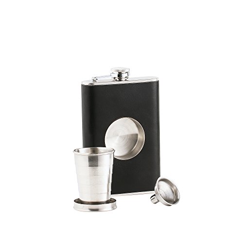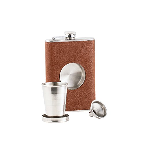 -. Feature : Durable & Stylish : 18/8 Food Safe Grade Stainless Steel Construction Hip Flask Body FDA approved . It Is Sleek, Stylish, And Holds 8 Oz of Liquid. The slender design makes this easy to stow in a purse or pocket or jacket. / INCLUDES 2 0Z SHOT CUP AND FUNNEL : Gift Set Includes A 2 Oz Collapsible Shot Glass, Mini Funnel , And Premium Flask . The collapsible shot glass is great for sharing , this flask's most interesting feature is its collapsible 2 oz. shot glass which inserts in the flask's center . The funnel is a nice addition and very Useful / Perfect For Any Occasion :Whether you're tailgating, headed to a barbecue, a wedding, ,Festivals ,Indoor and Outdoor Concerts , on the golf course or just ready for some classy drinking, Party, Camping, Fishing , Collection etc,this is the only set you need. You won't find another collapsible shot glass flask that comes with a flask funnel. / Great Gift Set :It's the perfect gift for anyone. Whether it's for your brother, boyfriend, sister, girlfriend, dad, husband, wife, son, daughter, friend, best man, groomsmen or anyone else. Anyone who receives the Flask & Funnel Shot Glass Flask set will be delighted. BUY NOW to be one step closer to enjoying a classy drink with the Flask & Funnel Shot Glass Flask set / WRAPED WITH LEATHER : The faux leather is very nice as it provides some grip and additional visual appeal. Sleek stainless steel wrapped with genuine leather for a luxurious look and feel.Durable and easily maintained
