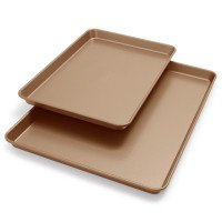 -. Feature : A staple baking piece with limitless possibilities, jellyroll pans and baking sheets are perfect for making everything from roasted veggies to classic chocolate chip cookies / This duo from KitchenAid features bar-reinforced edges, ensuring pans won't warp in the oven-and the PFOA- and PTFE-free nonstick coating makes for easy release / Durable and beautiful with a Warm Toffee finish, KitchenAid's heavyweight nonstick pans are built to meet the exacting standards of expert bakers-and they make baking a breeze for home cooks of every skill level / Constructed from aluminized steel for excellent heat transfer and warping resistance, each pan is designed to deliver the very best results for all of your favorite recipes / Baked goods release easily and completely thanks to the multilayer nonstick coating, making cleanup is a snap-and unlike most nonstick bakeware, these pans are dishwasher safe
