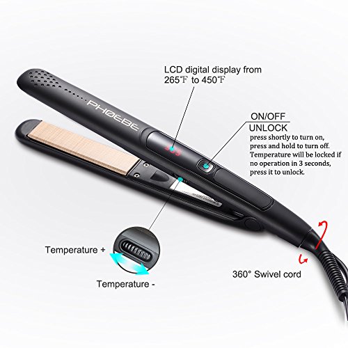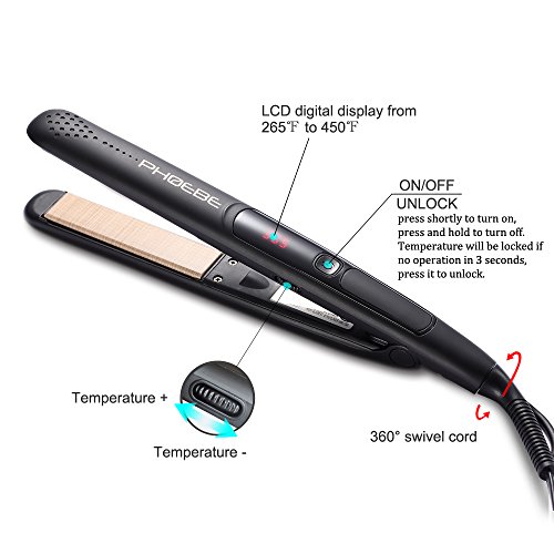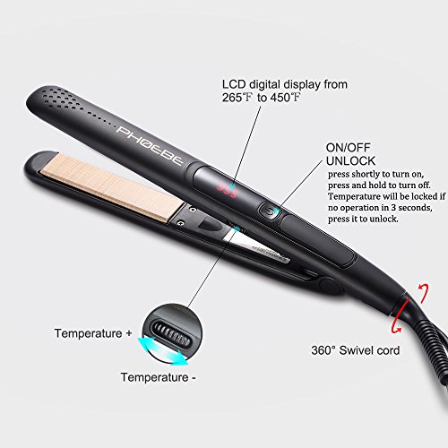 ? Temperature control by dial-pad button with LCD digital display, and auto shut off after 60 mins ON/OFF button:?press shortly to turn on or unlock, press and hold to turn off. Note:?after?you set the desired temperature, the temperature will be locked if no operation in 3 seconds, dial won't work. If you want to change the temperature again,?just press it to unlock the temperature. Dial-pad button:?dial forward to increase the temperature, while backward to decrease the temperature. It's characteristic that the dial-pad button can put forward/backward all the way without block.?When at maximal/minimal temperature, it can still dial forward/backward without temperature changes. LCD digital display from 265℉ to 450℉, suitable for all kinds of hair types 265℉-320℉:?suitable for first time user or thin, fine and normal hair 320℉-355℉:?suitable for wavy and curly hair 355℉-450℉:?suitable for coarse and thick hair