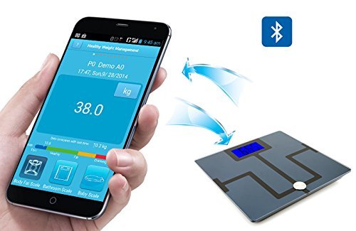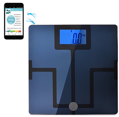 -. Feature : Measures: Body Weight, Body Fat, Body Water, Muscle Mass, BMI, BMR(KCAL), Bone Mass and Visceral Fat. / Using Bluetooth technology, the scale seamlessly uploads the measurements to the corresponding App that can be downloaded on iOS devices: iPhone4S Or higher, iPad 3, iPad Mini or higher.Android devices: Android 2.3 or higher OS with Bluetooth 2.2 or higher. Lower Version Android OS Devices and Android tablet may get a interrupted experience on Operating APP. / App tracks and records every measurement; Has table, list, and graph display options; Can store information for up to 10 users / High precision sensors measure in increments of 0.2 lb./0.1 kg; ITO layer provides a metal-less surface and higher sensitivity / The large tempered glass top is safe and supports up to 400lbs; 4.3" backlit LCD display with extra large number.