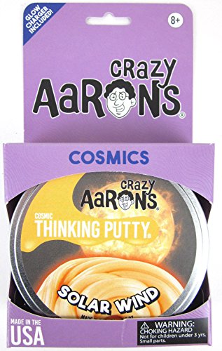 -. Binding : Toy -. Brand : Crazy Aaron's Thinking Putty -. EAN : 0688943129967 -. Feature : Includes a glow charger to activate the phosphorescent properties of all your super glowing putties. / Solar Wind putty part of Crazy Aaron's newest line of putty called "COSMICS." Solar Wind is an orange putty that glows in the dark when charged with the glow charger. / Large tin contains 3.2 oz / Glows in the Dark -. IsAdultProduct : 0 -. Label : Crazy Aaron's Thinking Putty -. Manufacturer : Crazy Aaron's Thinking Putty -. ProductGroup : Toy -. ProductTypeName : TOYS_AND_GAMES -. Publisher : Crazy Aaron's Thinking Putty -. Studio : Crazy Aaron's Thinking Putty -. Title : Solar Wind Crazy Aaron's Thinking Putty COSMIC Glow in the Dark Glitter Orange -. UPC : 688943129967