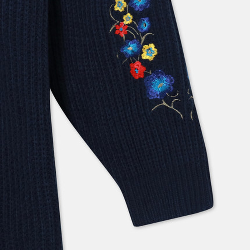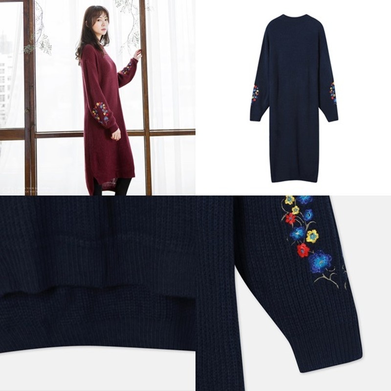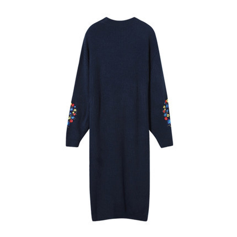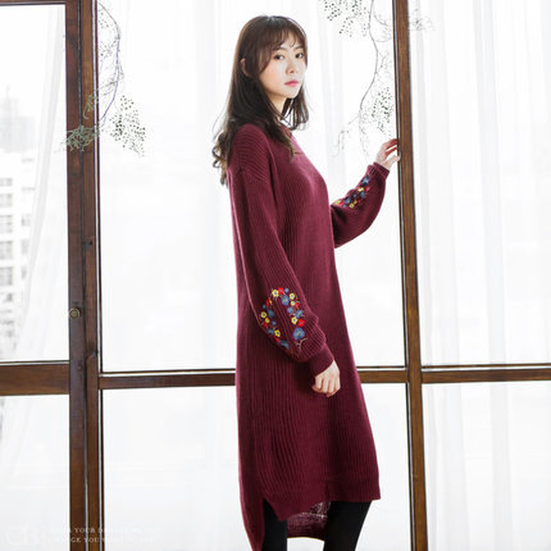 裾のすぼまった丸みのあるシルエットに 袖の花柄刺繍が可愛い、ゆったりめの ニットワンピースです♡