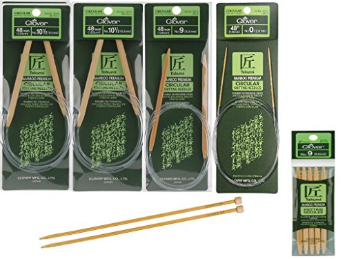 Clover Takumi Bamboo Circular Knitting Needles - Two 48 Inch Size 10.5; One 48 Inch Size 9; One 48 Inch Size 0; 5 Inch Double Point Needles Size 9 (5 pieces); 9 Inch Knitting Needles Size 2