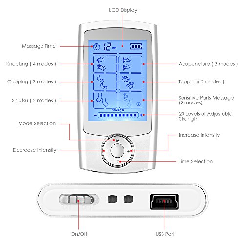 Features:? - 16 modes: 16 pre-programmed massage modes in a rectangular design: knocking ( 4 modes ), acupuncture ( 3 modes ), cupping ( 3 modes ), tapping massage ( 2 modes ), shiatsu massage ( 2 modes ) and sensitive parts massage ( 2 modes ). With the animated backlit LCD display, easy to read, you can easily choose the massage mode according to your need. And with the dual output design, you can simultaneous massage six parts of your body in maximum. - 20 levels: 20 varying levels of strength, allows you to get a favorable choice of the intensity grade for your pain to reduce. You can use the " " or " - " key to adjust the intensity level according to what you need. Besides, with the timer function, you can use the " T " key to adjust the massage time from 10 to 60 minutes.? Simulating ancient Chinese therapeutic methods, this messager can help you get an effective also safe pain-relief, alleviating sub-health, reducing fatigue, improving sleep quality and enhancing human immunity. It is a perfect gift for overworked people, housewife, driver and old people, etc.? Specifications:? AC adapter: 110 - 240V USB charge: 5V? Charging cable: 2.5 feet Package weight: 0.88lb Package Size: 5.63 x 3.03 x 2.76 inches Package content: 1 x massager 2 x large pads 4 x medium pads 2 x small pads 1 x USB cable 1 x AC adapter 3 x pad wires 1 x pads-sticking board 1 x English user manual 1 x schematic presentation of normal treatment points 0 |