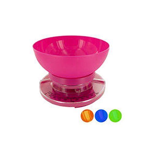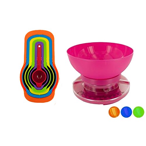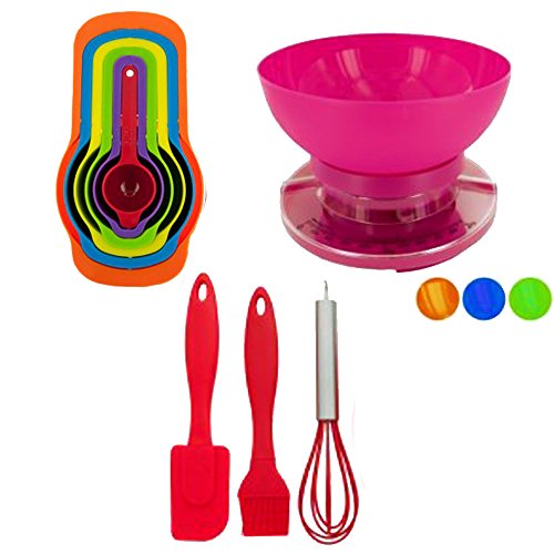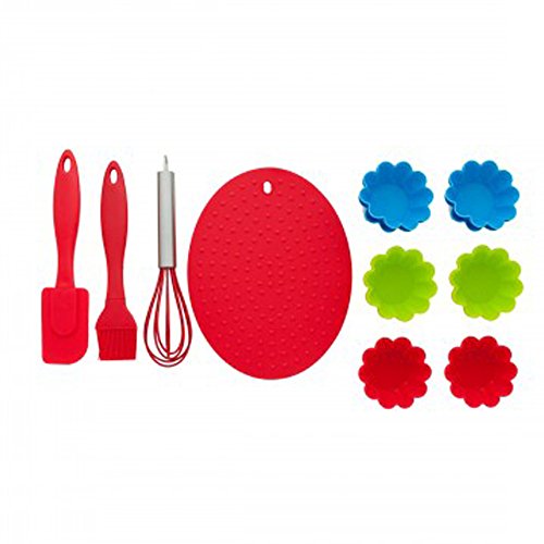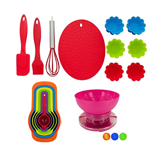BAKING SET FOR KIDS BUNDLE INCLUDES - 1 2000 gram kitchen scale with 1 removable bowl comes in assorted colors (no color choice), 6 silicone cupcake molds, 1 red silicone whisk with a metal handle, 1 red silicone spatula, 1 red silicone brush, 1 red silicone hot pad and 6 piece nesting measuring spoons and measuring cups includes ½ tablespoon, 1 tablespoon, ¼ cup, 1/3 cup, ½ cup and 1 cup.