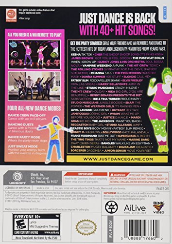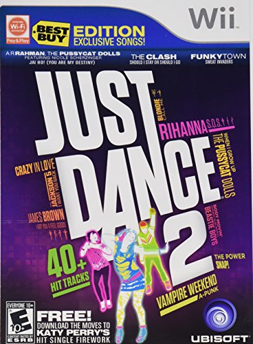 -. AudienceRating : PG (Parental Guidance Sested) -. Binding : Video Game -. EAN : 0008888176602 -. Edition : Standard -. ESRBAgeRating : Everyone 10+ -. Feature : Contains 3 extra songs not included in the regular edition : "Jai Ho! (You Are My Destiny)" by A R Rahman and The Pussycat Dolls featuring Nicole Scherzinger, "Should I Stay or Should I Go" by The Clash and "Funkytown" by Sweat Invaders. / Just Dance 2 contains more accurate movement recognition of the Wii Remote, allowing better dancers to reap the rewards of their superior skill / A soundtrack made up of over 44 new tracks from classic hits and legendary songs to today's chart-toppers / Like its predecessor, Just Dance 2 features iconic dance moves choreographed by real experts to every style of music / All new social-oriented modes and 8-player support deliver hours of multiplayer fun -. Genre : Action Games -. HardwarePlatform : Nintendo Wii -. Label : UBI Soft -. Manufacturer : UBI Soft -. OperatingSystem : Nintendo Wii -. Platform : Nintendo Wii -. ProductGroup : Video Games -. ProductTypeName : CONSOLE_VIDEO_GAMES -. Publisher : UBI Soft -. RegionCode : 0 -. Studio : UBI Soft -. Title : Just Dance 2 Best Buy Edition w/ 3 Extra Songs -. UPC : 008888176602