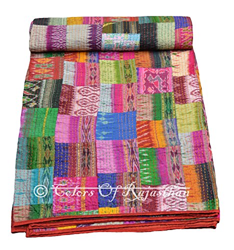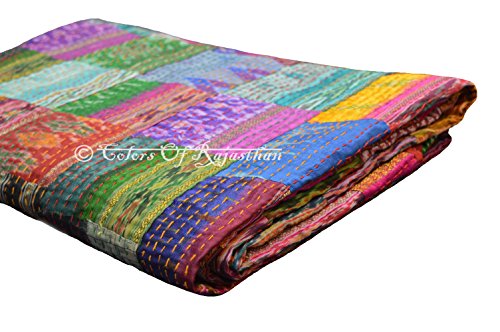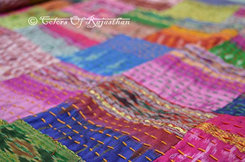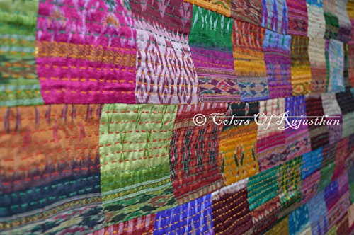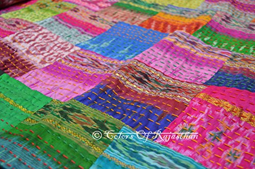 COR's Twin Size Patola Silk Patch Work Kantha Quilt , Kantha Blanket Bedspread, Patch Kantha Throw, Twin Kantha, Kantha Rallies Indian Sari Quilt, Size 60" X 90"