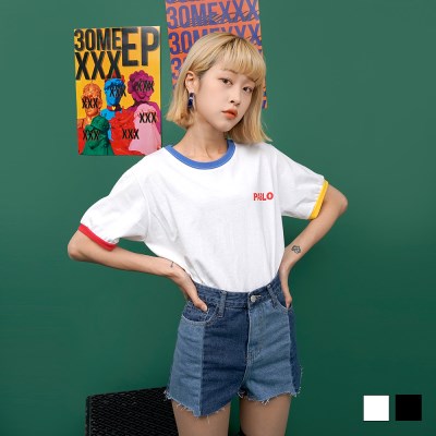 넥라인과 소매부분 모두 다른 컬러의 배색으로 포인트를 준 티셔츠에요 :-) 티셔츠 하나만으로도 유니크한 느낌을 주어서 어떠한 하의든 간편하게 매치하실 수 있습니다!