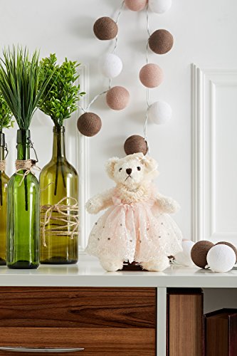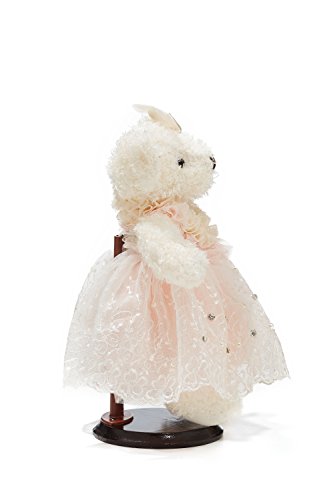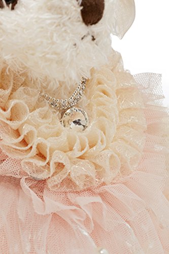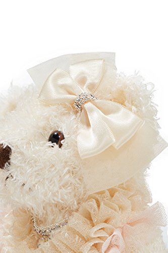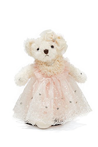 Lovely stuffed bear in a pink wedding dress decorated with crystals, faux pearls, embroidery and lace. The toy comes with a little hanging loop on the top of the head. Great start of a teddy bear collection and marvellous addition to the existing set.